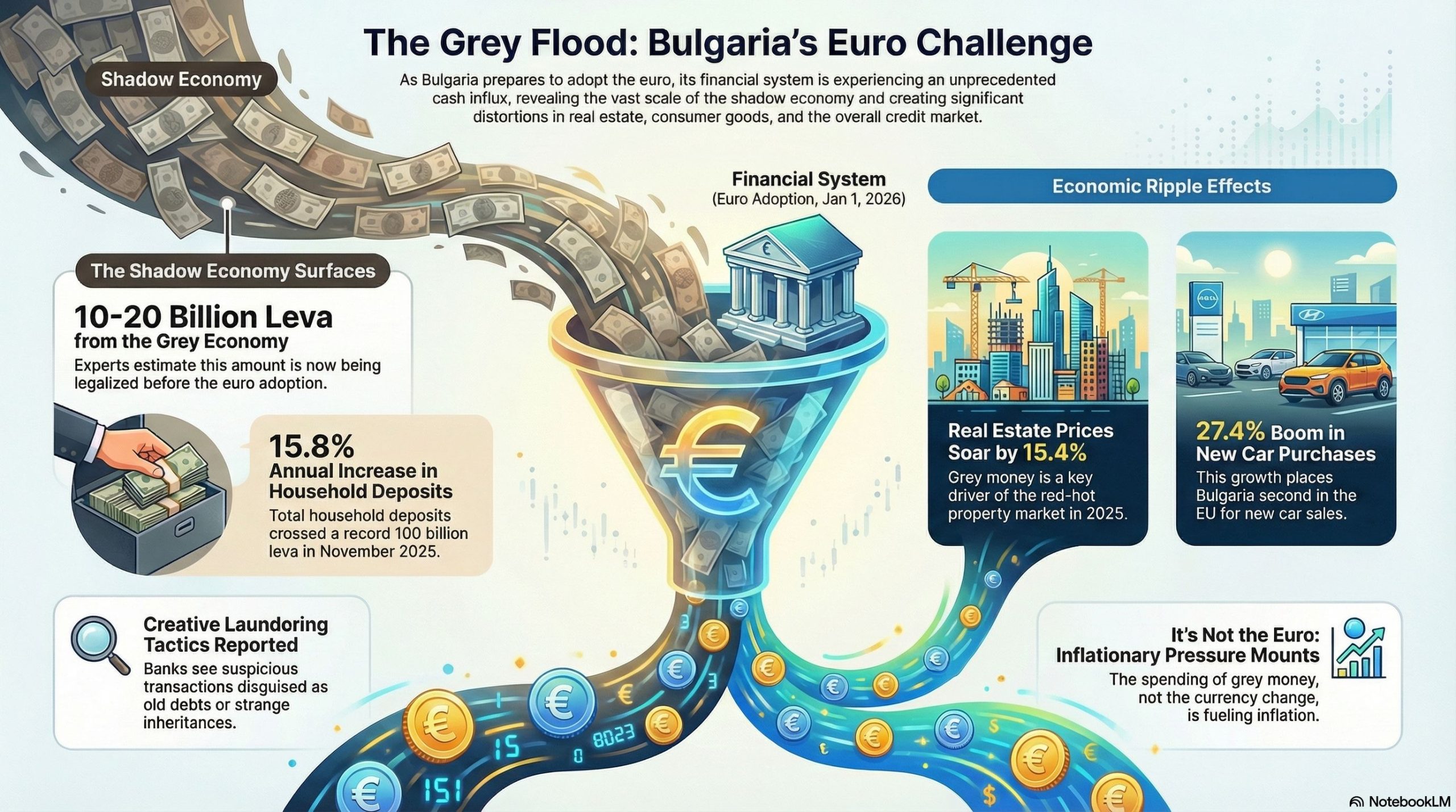 Behind the impressive statistics, however, lies an uncomfortable truth. When planning the quantities of euros needed to replace leva, the BNB and banks have calculated that of the 30 billion leva in circulation, at least 10 billion leva are grey. The lack of official statistics on the share of this money gives rise to even more disturbing estimates—some analyses suggest the sum could reach 20 billion leva.